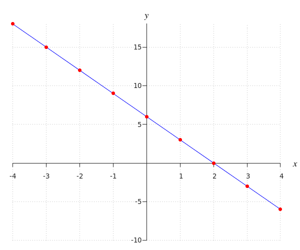 Allereerst maken we een tabel bij de grafiek. Daarvoor substitueren we de #x#-waarden in de functie. Voor #x=-4# vinden we dan #y=6-3\cdot \left(-4\right)=18#. De andere #x#-waarden gaan op dezelfde manier en dan vinden we onderstaande tabel.
