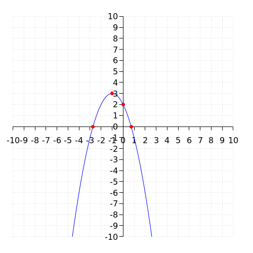 Stap 3 | De snijpunten met de #x#-as zijn de punten waarvoor geldt #y=0#. \[\begin{array}{rcl} -x^2-2\cdot x+2 &=& 0 \\&&\phantom{xxx}\color{blue}{\text{de op te lossen vergelijking}}\\ x=\dfrac{-{-2}-\sqrt{\left(-2\right)^2-4 \cdot -1 \cdot 2}}{2 \cdot -1} &\vee& x=\dfrac{-{-2}+\sqrt{\left(-2\right)^2-4 \cdot -1 \cdot 2}}{2 \cdot -1} \\&&\phantom{xxx}\color{blue}{\text{abc-formule ingevuld}}\\ x=-\sqrt{3}-1 &\vee& x=\sqrt{3}-1 \\&&\phantom{xxx}\color{blue}{\text{uitgerekend}}\\ \end{array}\] De coördinaten van de snijpunten met de #x#-as zijn dus: #\rv{-\sqrt{3}-1,0}# en #\rv{\sqrt{3}-1,0}#. Om de waarden in de grafiek te tekenen, moeten we ze afronden. Dat geeft: #\rv{-2.7,0}# en #\rv{0.7,0}#. |