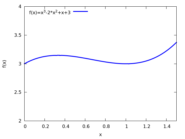 Deze waarden zijn de oplossingen van de vergelijking #f'(x)=0#. De afgeleide van #f# wordt gegeven door\[f'(x)=3x^2-4x+1\tiny.\] We hebben dus te maken met een kwadratische vergelijking met onbekende #x#. Met de abc-formule vinden we \[x_\pm=\frac{4\pm\sqrt{(-4)^2-4\cdot 3\cdot 1}}{2\cdot 3}=\frac{4\pm\sqrt{4}}{6}=\frac{4\pm2}{6}\tiny,\]zodat #x_-={{1}\over{3}}# and #x_+=1#. In onderstaande grafiek is te zien dat de oplossing #x_-={{1}\over{3}}# hoort bij een lokaal maximum van #f# en de oplossing #x_+=1# bij een lokaal minimum.