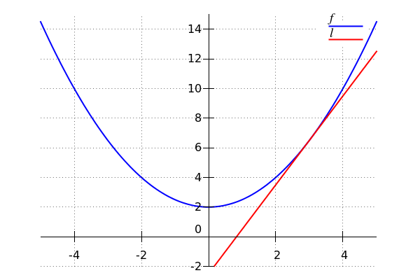 Verder is de helling #f'(a)# van #f# in #a# gelijk aan de helling van deze lijn. De lijn is dus de unieke rechte door #\rv{a,f(a)}# met helling #f'(a)#. Dit betekent dat het de raaklijn aan #f# in #a# is.