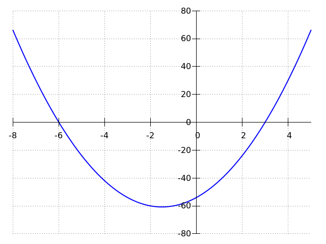 De grafiek van de functie # 3 x^2+9 x-54# is hieronder getekend. De #x#-coördinaten van de snijpunten van de grafiek met de #x#-as zijn de oplossingen van de vergelijking.