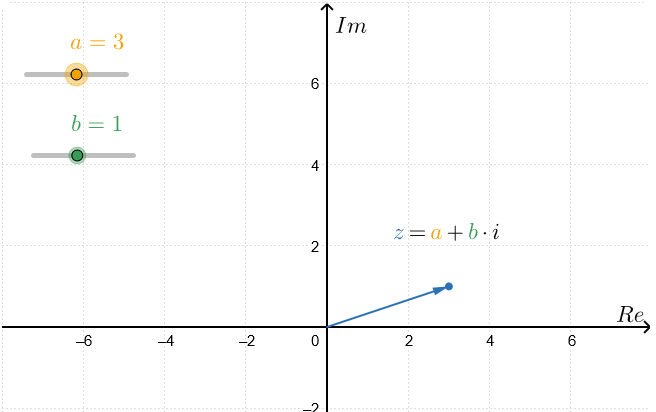Laat #\blue{z}= \orange{a} + \green{b}\cdot\complexi#. In het Argand-diagram wordt dit getal weergegeven door een vector waarvan het eindpunt (de pijlpunt) de coördinaten #\rv{\orange{a},\green{b}}# heeft. Met andere woorden, de horizontale as geeft het reële deel van een complex getal aan, terwijl de verticale as het imaginaire deel aangeeft.