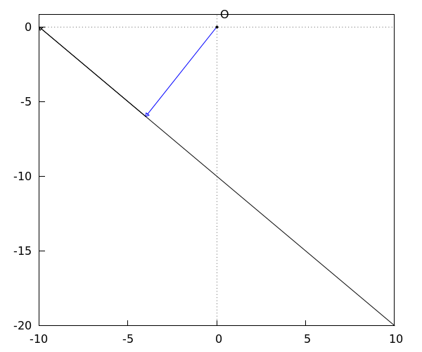 The position vector #\rv{-4,-6}# is drawn in blue. The directional vector #\rv{-6,6}# and the line #\ell# are drawn in black..